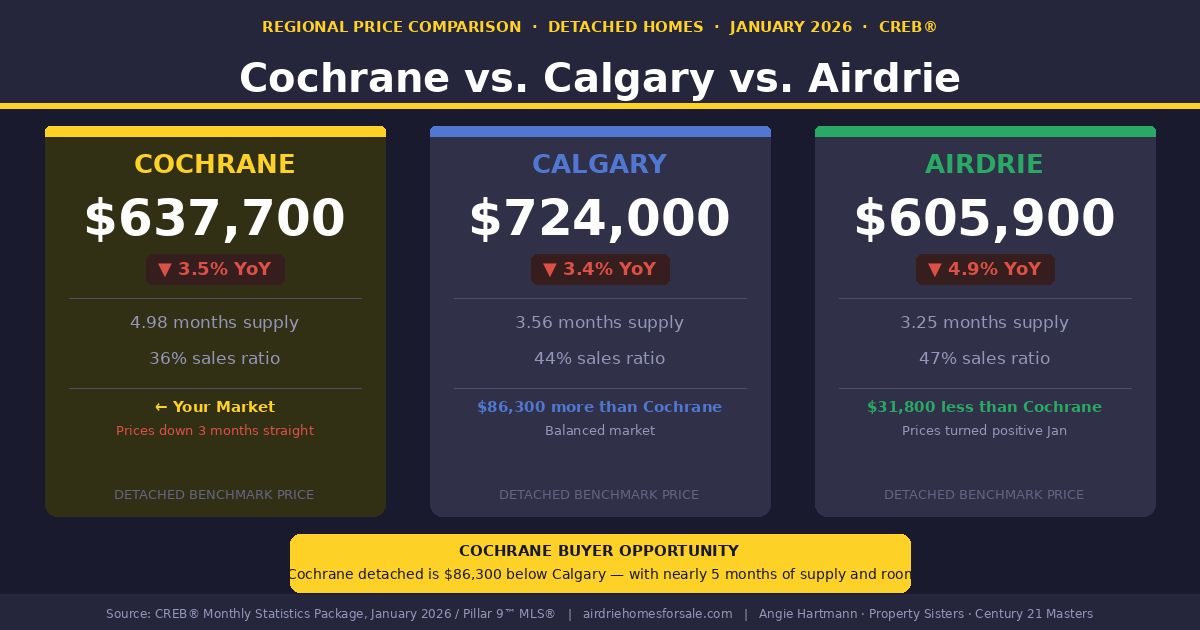 Second, buyers in Cochrane have real alternatives. Airdrie is $31,800 cheaper on a detached basis and has a more stable supply picture. Calgary offers more urban amenities. Okotoks offers lower supply and strong community appeal. A Cochrane listing that is not compelling on price and presentation will lose buyers to these alternatives, not simply wait them out.
